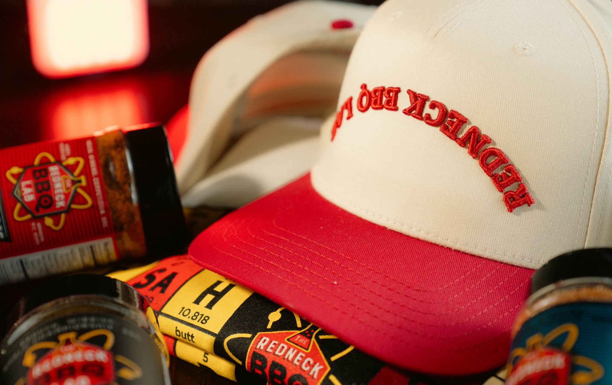 A tan and red combo that stands out from the crowd. Features the signature “Redneck Barbecue Lab” design stitched proudly across the front—your go-to hat for everyday wear or the next cook-off.